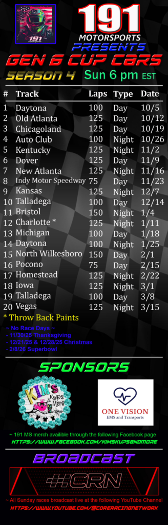 191 Motorsports is a league that hosts NASCAR Gen 6 racing on Sunday nights on the CORE Racing Network