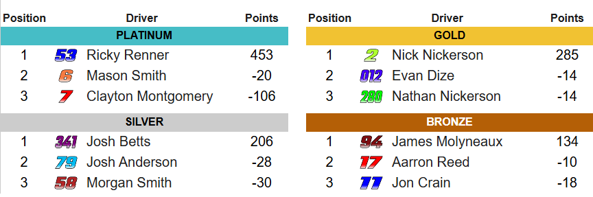 | Position | Div Position | Driver | Division | CORE Rating | Starts | Wins | T-5 | T-10 | Best Drop Pts | Race Pts | Bns Pts | Pen Pts | Total Pts | Behind Lead | Behind Div Lead |