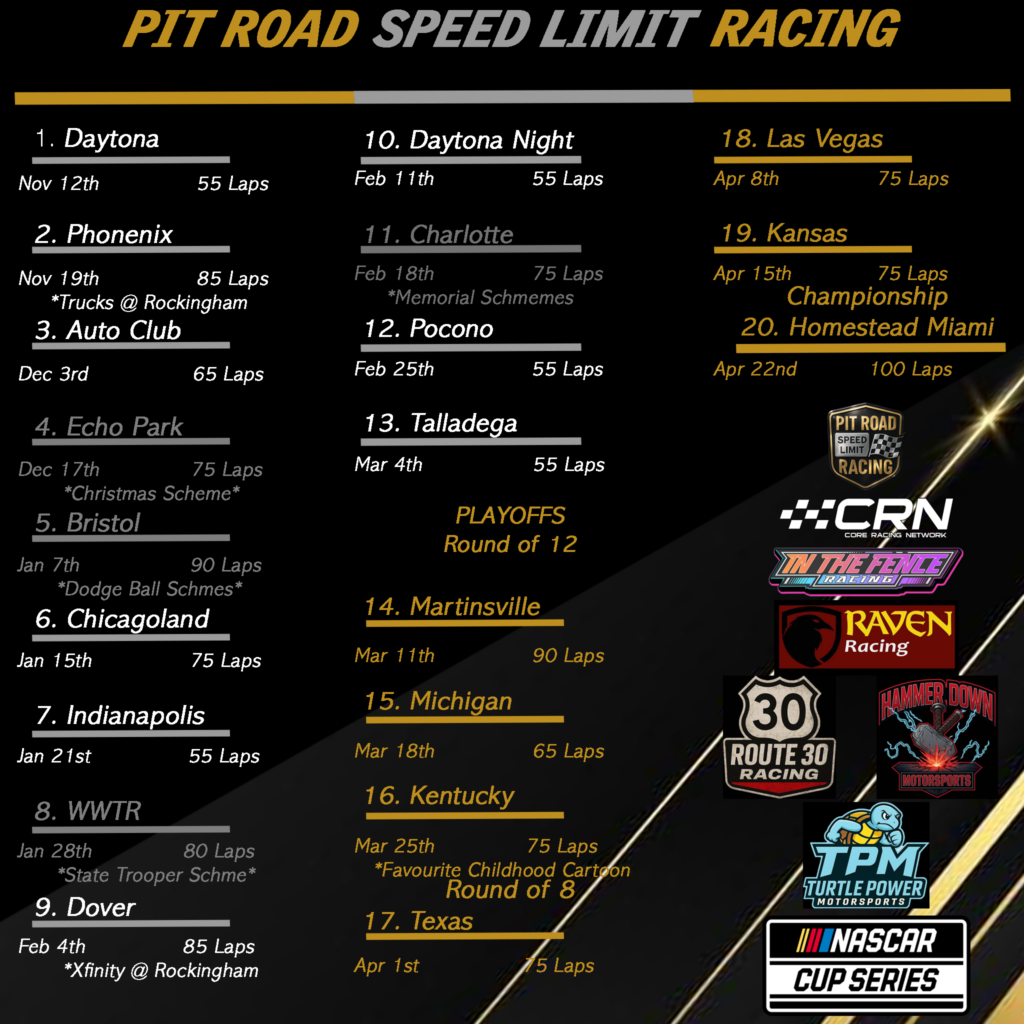 Pit Road Speed Limit Racing is a league that hosts NASCAR Next Gen racing on Wednesday nights on the CORE Racing Network